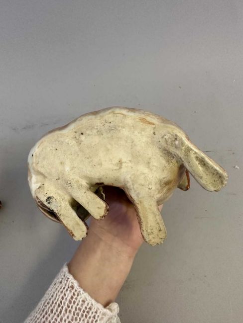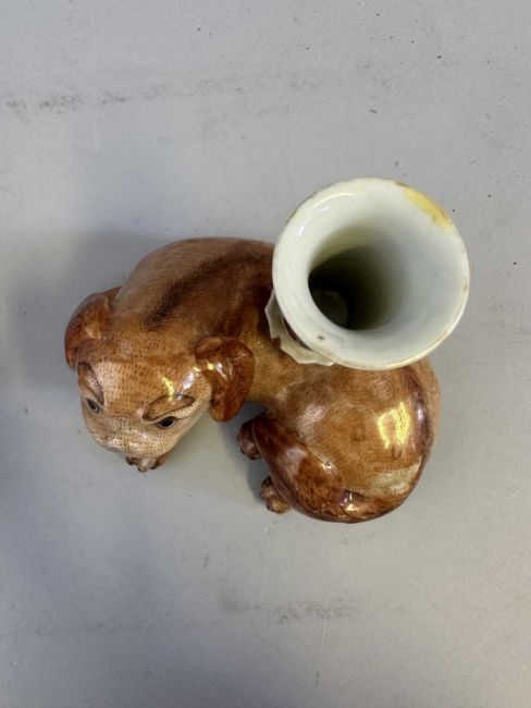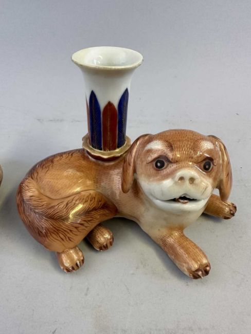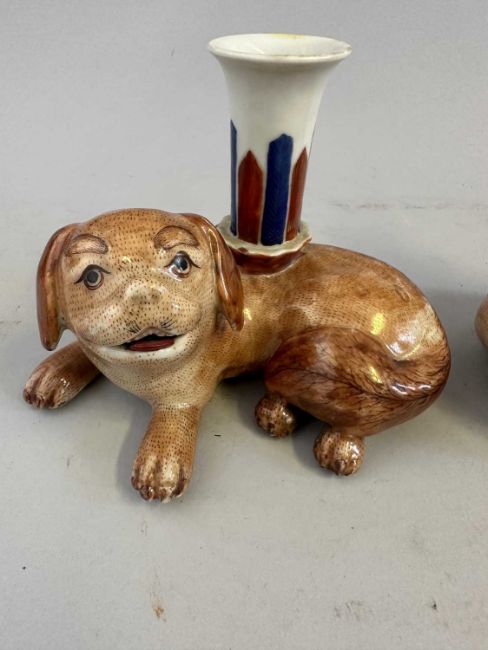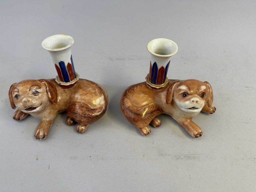 One pug dog has restoration to approximately half of the rim of the vase, the other has two small restored rimchips to the vase and an associated circa 2cm hairline rim crack.