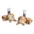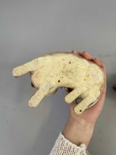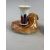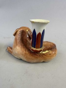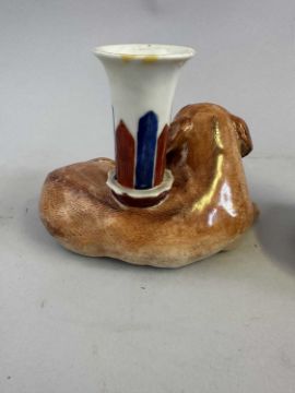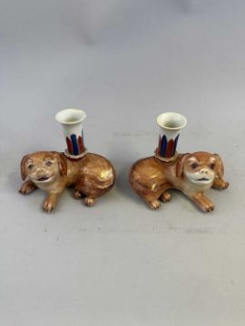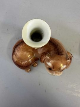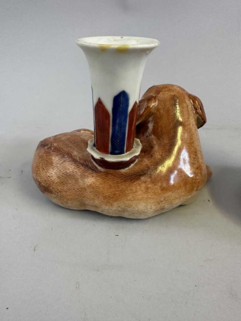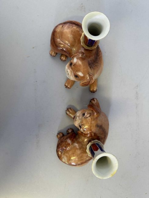 each modelled in mirror image, recumbent and with head raised looking alertly to the left and right, the bushy tail swished over the rear haunches and the fur decorated in orange-brown, supporting a beaker vase-shaped candle-holder on the back, 16.5cm wide