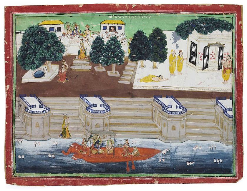 gouache with gold on paper, the couple riding on a boat with elephant prow, ghats and village with shrine, well and cattle in the background, inscription in white at the top, surrounded by red border, 25.5 x 33.5cm