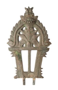 in the form of a leafy arch (torana), with five headed cobra and kirtimukha head at the top, two projecting tenons at the bottom, 23.5cm high