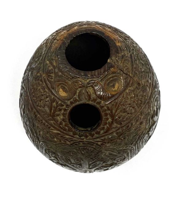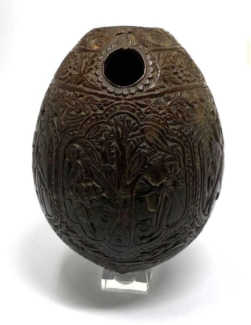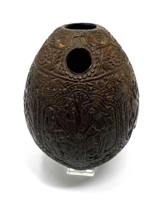 the nargila perhaps carved by a lascar (sailor) with a band of figures and animals in shaped cartouches surrounded by foliage and geometric patterning, 11cm long, cracked