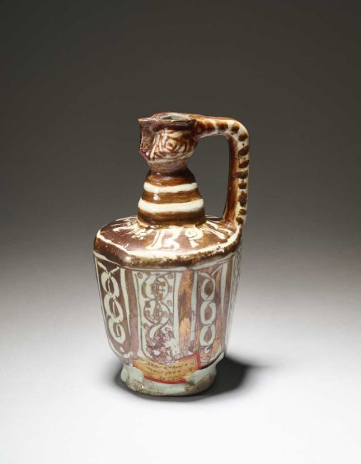 the faceted sides with scrolling arabesque and leaf designs, the shoulder with a frieze of kufic script, with pinched spout and angular handle, old label near base reading [...] MINASSIAN NEW YORK CITY 1800, 14.5cm high