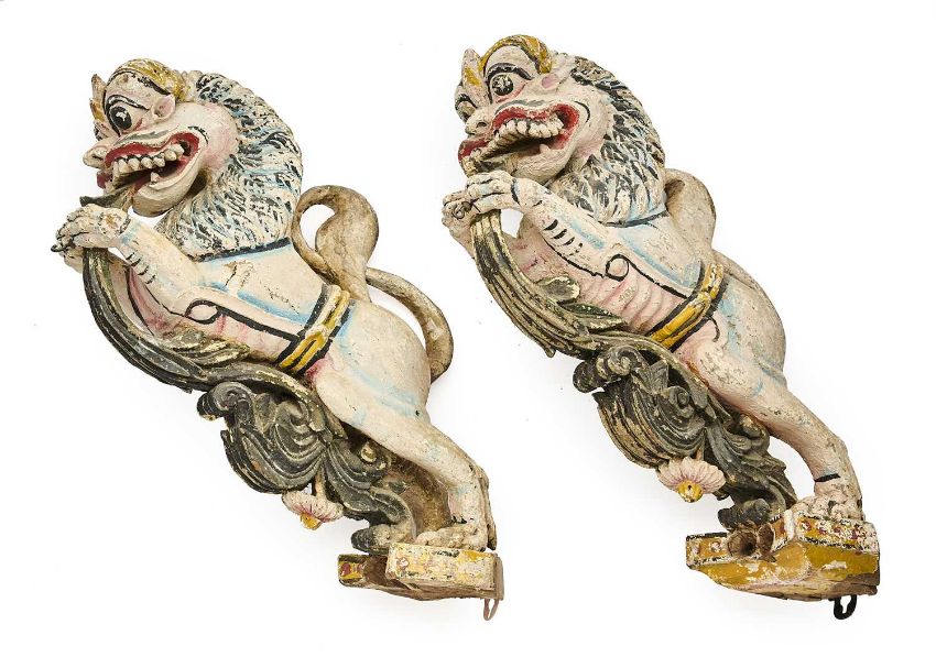 each in the form of a mythical lion, with bulging eyes and bared teeth, a leafy scroll issuing from its mouth, 63cm approx. each