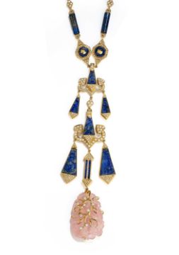 supporting a Chinese carved rose quartz pendant depicting a pair of peaches, encased within a foliate cage accented with brilliant-cut diamonds, to a graduated connecting chain of anchor motifs set with brilliant- and single-cut diamonds and lapis lazuli panels, to a necklace of lapis lazuli batons, and textured fIgure of eight links, interspersed with diamond set connecting links, necklace 40cm long, pendant 17cm long