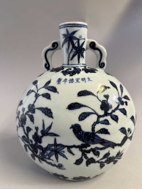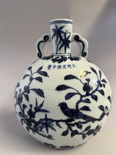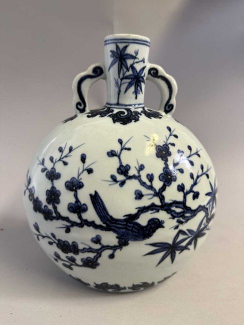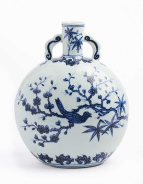 the flattened globular body rising from a flat foot to a tall narrow cylindrical neck set with a pair of ruyi handles, painted to the front face in rich cobalt-blue tones with a bird perched on a flowering peach blossom branch, below the apocryphal six-character Xuande mark and between curling leaf bands, the reverse similarly painted with a bird perched on prunus, the neck with bamboo sprays, 27cm high