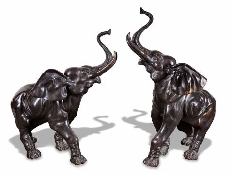 each naturalistically modelled standing four-square with head and trunk raised, the metal patinated to a dark chocolate tone, 124.5cm high