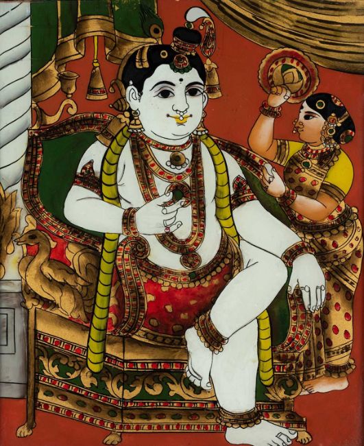 depicting the youthful Krishna, eating butter, with female attendant, framed, 29 x 25cm