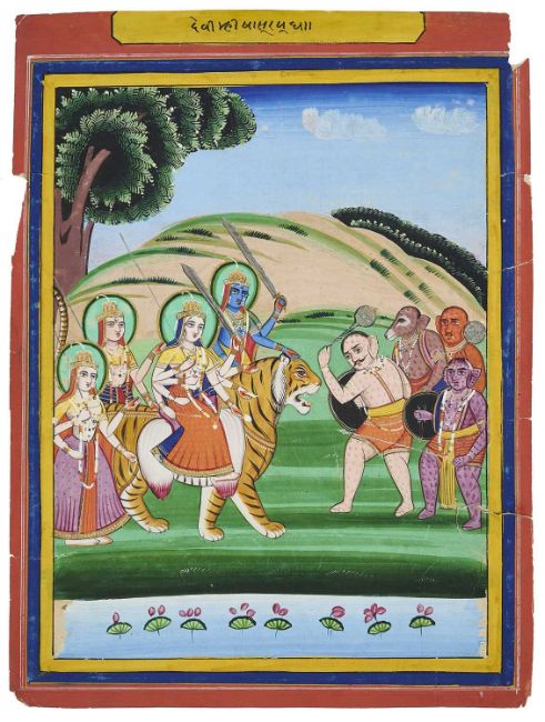 gouache with gold on reused paper, depicting the goddess Durga riding her vahana, the tiger, into battle against four demons, assisted by three other goddesses, surrounded by a hilly wooded landscape, a river in the foreground, an inscription in a cartouche above, 31 x 23.5cm (main image)