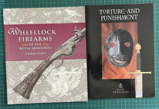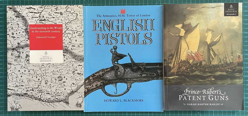 Teesdale, Edmund B., Gunfounding in the Weald in the sixteenth century (Monograph 2), 1991; Bartlett Wells, H. (trans.), European Crossbows: A Survey by Josef Alm (Monograph 3), 1994; Liebel, Jean, Springalds and Great Crossbows (Monograph 5), 1998; Bailey, Sarah Barter, Prince Rupert's Patent Guns (Monograph 6), 2000; Blackmore, Howard L., English Pistols, 1985; Civil War: a Royal Armouries Exhibition, 1992; Royal Armouries Official Guide, 1996; Royal Armouries Museum, 1996 & 2000 editions; Royal Armouries Yearbook, Volume 3 1998 & Volume 4 1999; Blackmore, David, Arms & Armour of the English Civil Wars, 1990; Torture and Punishment, 1997; Royal Armouries: Fort Nelson, 2000; Rimer, Graeme, Wheellock Firearms of the Royal Armouries, 2001; An Introduction to Japanese Armour, 2002; Richardson, Thom, The Armour & Arms of Henry VIII, 2002; together with Norman, A.V.B. & Wilson, G.M., Treasures from the Tower of London, Norwich, 1982; and Hammond, Peter, The Tower of London, Department of the Environment, 1989 (19 volumes)