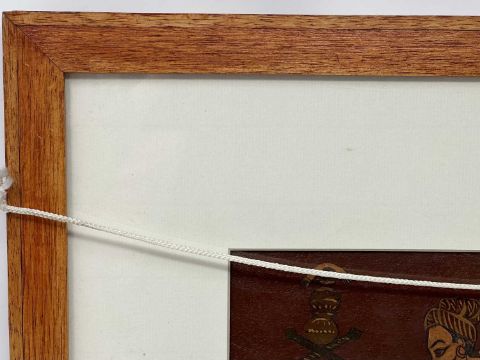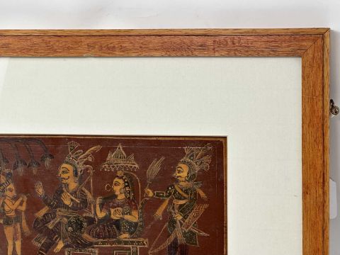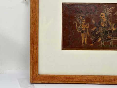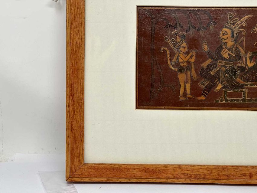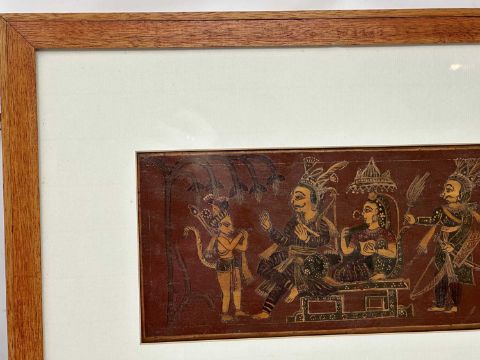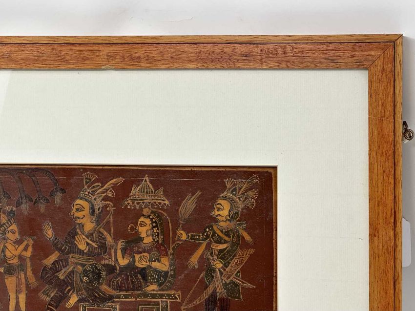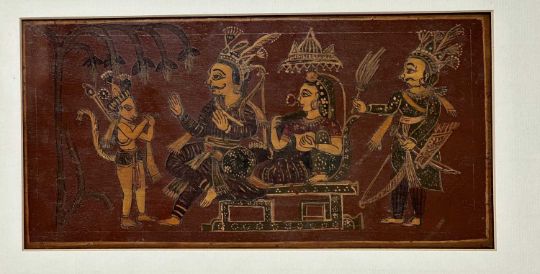 painted wood panel, of horizontal rectangular form, depicting Rama and Sita with Hanuman and Lakshmana on one side, and two erotic mithunas on the reverse, framed, 14 x 28cm (inside mount)