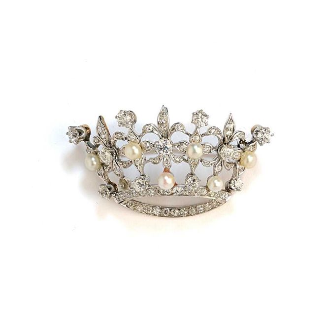 designed as a coronet set with circular-cut diamonds and pearl detail, one pearl deficient
