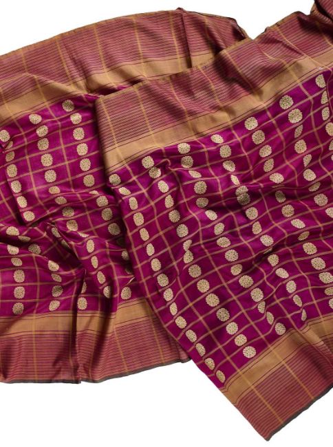 each of long rectangular form, with gilt metal thread decoration composed of repeated foliate medallions on magenta ground, 480 x 104cm; 410 x 112cm