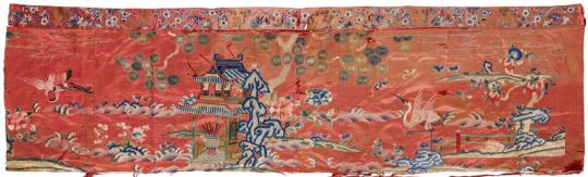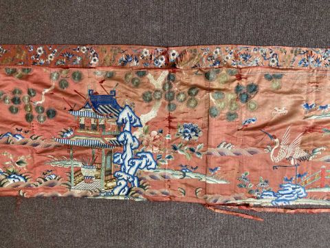 depicting a pavilion amidst peach trees issuing from lingzhi form rockwork, with cranes in flight over head, all reserved on a salmon ground, 60 by 200cm, together with another, smaller, depicting a stylised landscape on black ground, 24.5 x 26cm