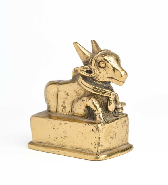 the bull vehicle of Siva crouching on a raised rectangular plinth, a small sivalingam in front, 7cm high