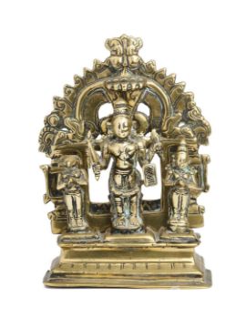 cast in five section, the central figure of Virabhadra under a five headed cobra, holding sword, shield, bow and trident, flanked by the goat headed Daksha and his daughter Sati, the arched aureole behind with makaratorana surmounted by Kirtimukha, 15.5cm high
