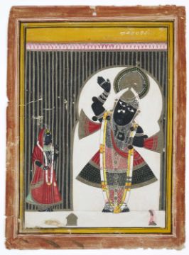 gouache on paper, the deity with right hand raised, wearing flared coat and peacock feather crown, inscription in white devanagari at the top, 28 x 19.7cm (main image)