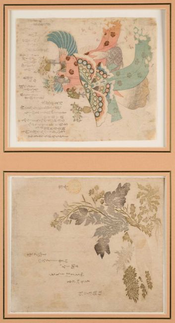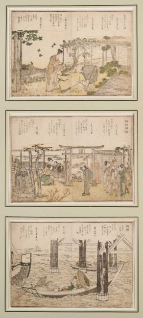 from ‘Toto Shokei Ichiran’ (Fine views of the Eastern Capital at a Glance), mounted, each image 21 by 29.5cm; together with two surimono, one unsigned, depicting figures performing a butterfly dance and, Ryurykyo Shinsai (1799-1823), a surimono, depicting a giant radish, mounted together, the larger image 21.5 by 19cm.