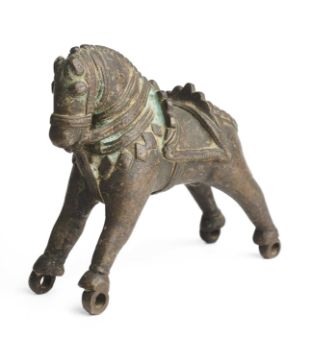 wearing blanket and trappings, his feet with loops for wheels (now missing), 11cm high