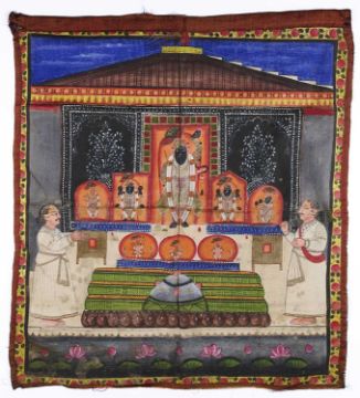 pigment on cloth, of rectangular form, depicting Sri Nath Ji in a shrine, piled offerings flanked by priests in front, the river Yamuna in the foreground, later silk lining with the top edge stitched to form a hanging loop, 93 x 85cm