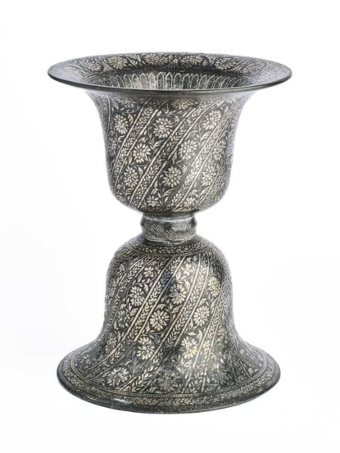 lead and zinc alloy with silver inlaid decoration, of twin bell-shaped form, the design comprising spiralling bands of leaf motifs alternating with scrolling chrysanthemums, the upper lip similarly decorated, 23.5cm high
