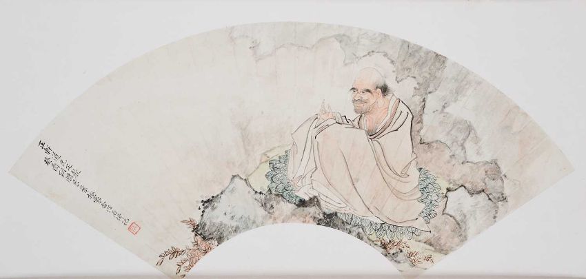 ink and colour on paper, folding fan, depicting a Luohan in a rocky landscape, 52cm wide, framed and glazed