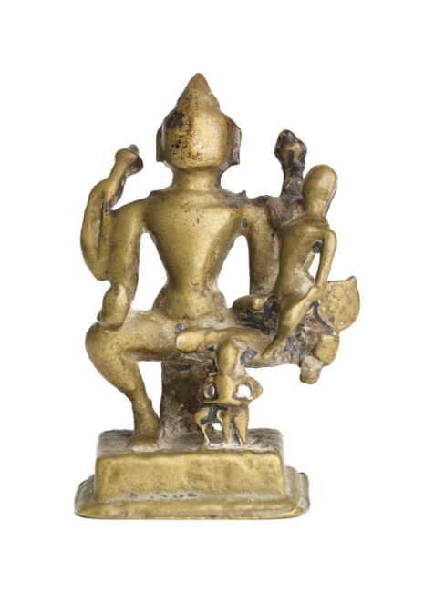 the four-armed figure of Vishnu seated with his consort on his left knee, a diminutive figure of Garuda at his feet, 9.2cm