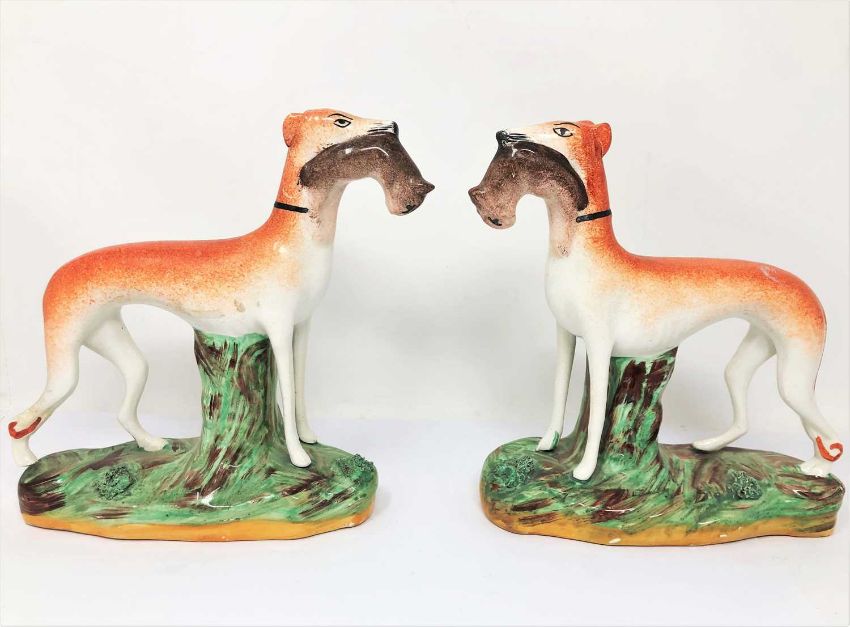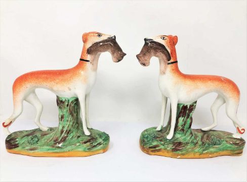 modelled seated on a tree stump holding a pistol, a barrel at his side, 34cm high; together with a pair of Staffordshire pottery figures of 'Shakespeare' and 'Milton', Milton fired without his right arm; together with a Staffordshire figure of 'Falstaff'; and a pair of Staffordshire figures of greyhounds, circa 1900, each standing supported by a tree stump and holding a hare in its mouth, on naturalistic oval bases, 20cm high (6)