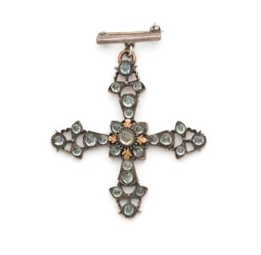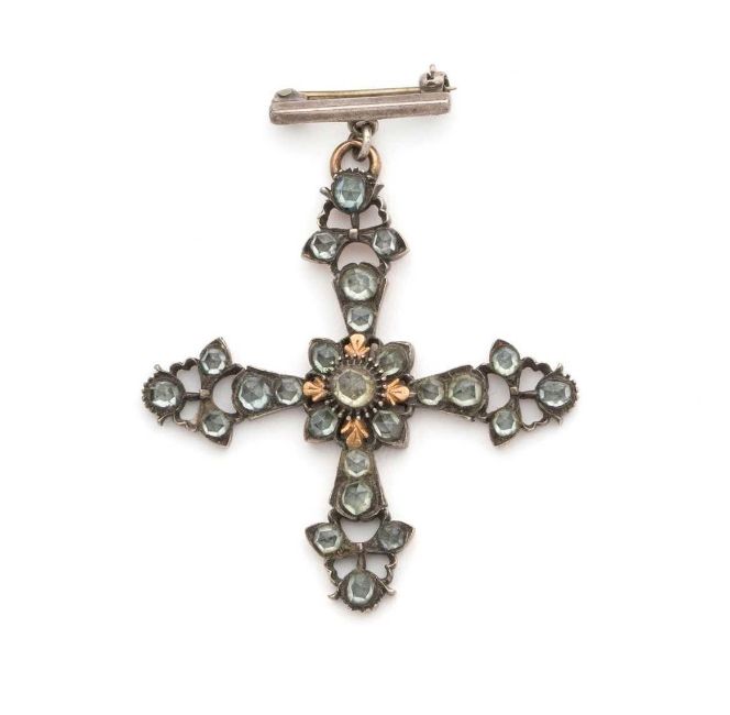 designed as a cross set with rose-cut jargoons, mounted in silver and backed in gold, later brooch pin fitting, dimensions 5cm x 5cm