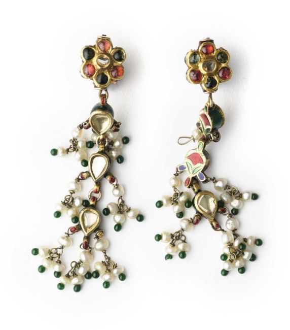gold set with lasque-cut diamonds, rubies and emeralds, each in the form of a rosetee with a trio of drops hanging in line below, fringed with pearls, later piercing attachments, 5.5cm each approx.
