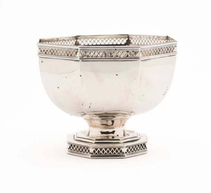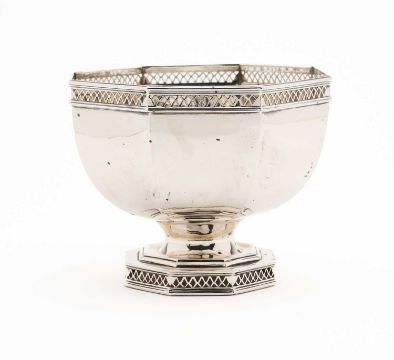 the octagonally faceted body with a rim of kite-shaped piercing between reeded borders, on a conforming short pedestal foot, 15.5cm wide, 246g
