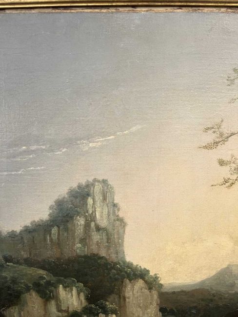 The canvas is relined, with a soft relining to the back. There are areas of retouching, notably below the figures along the bottom of the canvas, and to the left of the rocks which appears to correspond to an old horizontal tear (approx 15cm), there is also some light retouching in the lower part of the sky, and some very fine occasional areas of craquelure (only visible on close examination).
