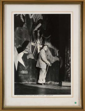 1986, matte silver gelatin print of John Hayes as Archie Rice signed and dedicated To John and Helen at Cranmer's, 7th Summer Ball, John Hayes, 38 x 28cm; 50.5 x 58.5cm (framed); together with a chromogenic print of The Shaftesbury Theatre showing The Entertainer, cast including Peter Bowles, 26 x 38cm; 29 x 41cm (framed)