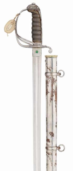 of regulation type, with etched blade (edge slightly ground in places) including regimental details and the crowned Royal arms, retailer’s details at the forte, in its steel scabbard (areas of rust), 87.0 cm blade