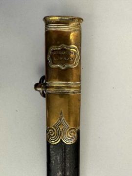of regulation type, with etched blade including the maker’s details ‘Herbert & Co., London’, gilt copper alloy hilt (side-guard missing), wire-bound fishskin-covered grip, in it leather scabbard with copper alloy mounts, 81.8 cm blade