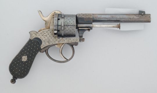 with blued sighted rifled barrel engraved with trelliswork enriched with a repeated pattern of small punched stars and small silver dots, part octagonal breech, blued cylinder and trigger-guard all decorated en suite, frame and butt retaining their dull grey finish and also decorated en suite, blued hinged loading-gate, bright hammer, cartridge extracting rod and trigger, chequered rounded ebony grips enriched with silver nails, suspension mount, and retaining much of its original finish, 12.5 cm barrel