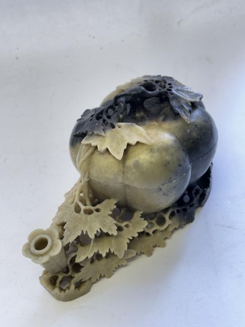 naturalistically carved, the cover with a long leafy stem that falls down and around the underside of the box forming a base, the stone of mottled celadon and black tones, 19cm long