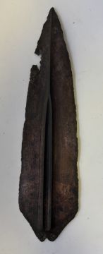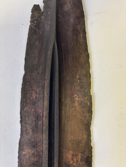 of copper-alloy and of double-edged leaf-shaped form (incomplete on one side towards the tip), a medial ridge to the point on both sides widening to form a tapering flute over most of its length and flanked on either side with very finely incised lines, the base pierced with two small holes, 28.0 cm