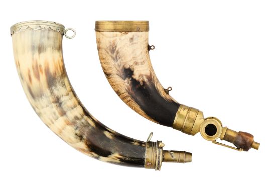 with mottled cow horn body of curved flattened triangular form, copper alloy mounts including Boche Patent top with horn muzzle plunger linked to the sprung drum-shaped charger by a hinged copper alloy bar, the charger stamped ‘Boche I eur A Paris’ and with glass inspection widows, and two small suspension rings; together with a composite powder-horn with copper alloy top and adjustable nozzle, the former stamped ‘Dixon & Son Patent’, white-metal basal plate, and two suspension rings, 26.0 cm and 28.0 cm (2)