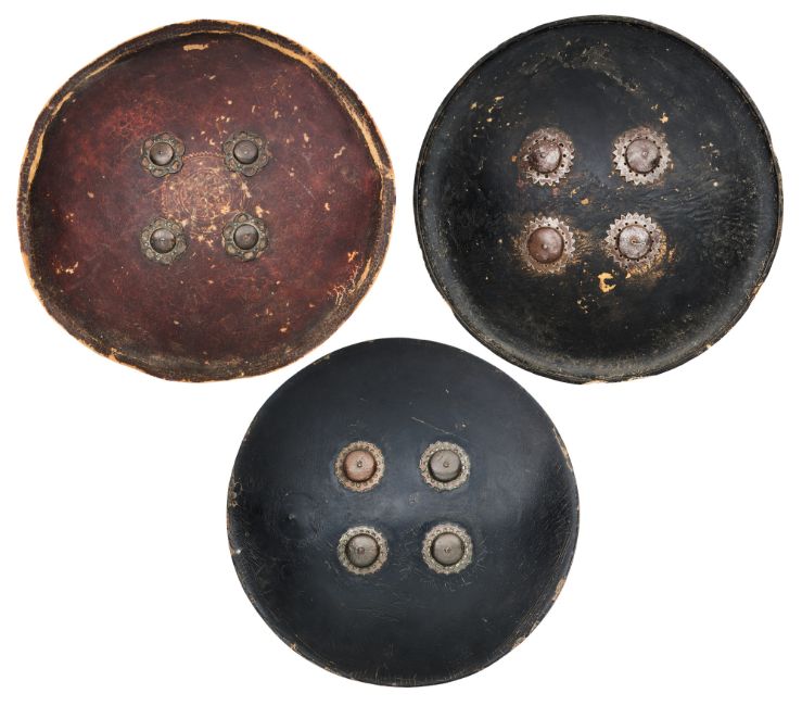 each of convex leather, two lacquered black and with four domed copper-alloy and steel bosses respectively, and each retaining its interior pad and en armes, the last lacquered brown (old surface crazing) and with four pierced copper-alloy bosses, the interior with three iron rings (one missing), (all with some loss of finish), 43.5 cm to 46 cm diameter (3)