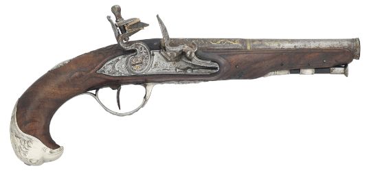 with two-stage barrel (some old wear and rust patination) turned at the muzzle and mid-section, the forward section gilt with a fleur-de-lys centred on sprigs of foliage, octagonal breech becoming polygonal and decorated with rocailles and foliage en suite, border engraved tang with a foliate rocaille, signed border engraved flat bevelled lock engraved with scrolls on the stepped tail, bevelled cock engraved with foliage, figured moulded full stock with rounded butt and carved with foliage behind the rear ramrod-pipe, and with crossed palms behind the barrel tang, mounts cast and chased with relief against a finely punched ground, and comprising shaped side-plate with a hound and a martial trophy within a border of foliage, vacant foliate escutcheon, trigger-guard with rocailles and foliage on the bow and finial, eagle-head pommel in the round, turned ramrod-pipes, and steel-tipped ramrod, 16.0 cm barrel
