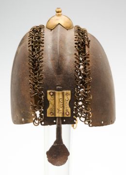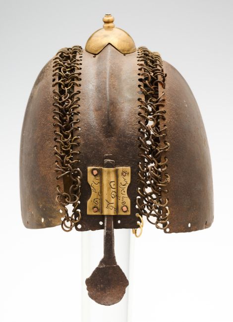 of russet iron, comprising a broad central band with medial ridge over the top of the head surmounted by a modern copper-alloy dome with button finial, a large rounded plate covering the ear on either side (one with old repairs along the bottom edge), the borders over the top of the head pierced with circular holes of brass and iron mail (some missing and some replaced), the front with rudimentary bar-nasal secured by a copper-alloy mount incised with Islamic script (pitting overall), 18.0 cm high