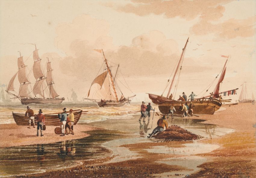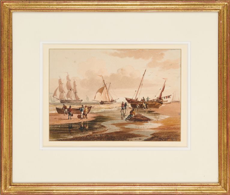 SHIPPING OFF THE NORFOLK COAST WITH SAILORS ON THE BEACH