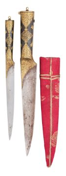 formed entirely of steel, with watered single-edged blade gold-damascened with foliage on both sides of the forte and partly along the back, rounded hollow hilt damascened en suite and including a cartouche containing Arabic calligraphy on each side, hinged gold-damascened pommel-cap with ring for suspension and sprung button catch, opening to reveal a smaller kard en suite, in its wooden scabbard covered in silk brocade flowers, 20.0 cm and 17.0 cm blades