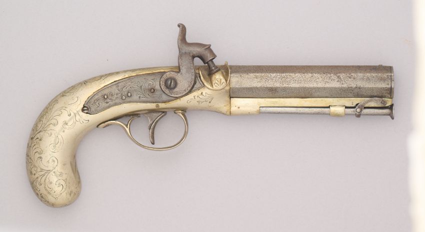 with octagonal sighted barrel (light pitting) engraved ‘London’ along the top flat, and struck with Birmingham proof marks, foliate scroll engraved rounded back-action lock (hammer replaced), white-metal half-stock with rounded butt engraved with scrolling foliage, white-metal trigger-guard en suite, plain white-metal under-rib, and stirrup ramrod, 10.0 cm barrel