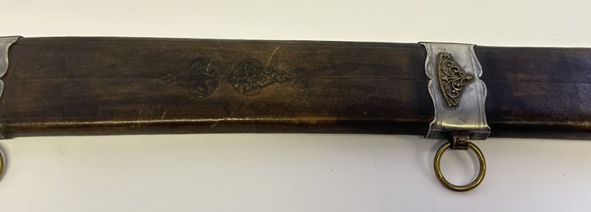 broad, sightly curved and double-edged at the clipped-back point, both sides with converging narrow fullers and incised with a row of ‘eyelash’ marks along the back, the fullers at the forte each struck with a saltire mark between two star marks, a similar arrangement of marks on one side of the ricasso on both sides, tapering tang (adapted at the top and now threaded, old pitting), and modern silver quillons struck with unidentified marks beneath, in modern wooden scabbard covered in brown leather lightly tooled on the outside and with shaped steel chape and suspension mounts with applied copper-alloy decoration, and two rings for suspension, 83.0 cm including tang
