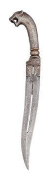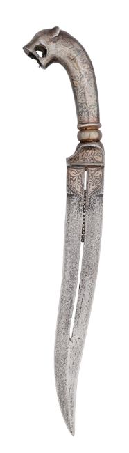 with distinctly watered slightly recurved double-edged blade pierced centrally with a slender slot containing numerous free-running steel balls known as ‘The Tears of Allah’, the forte on both sides and the pinched-in basal mount damascened with silver foliage, steel hilt en suite and including pommel formed in the round as a stylised tiger’s head, 23.0 cm blade