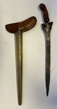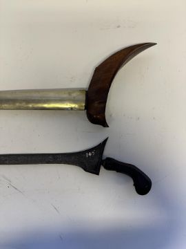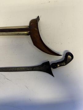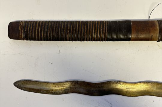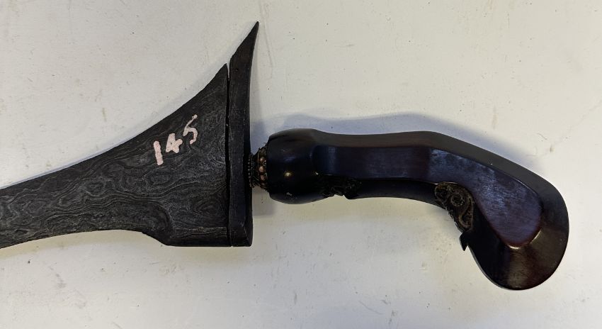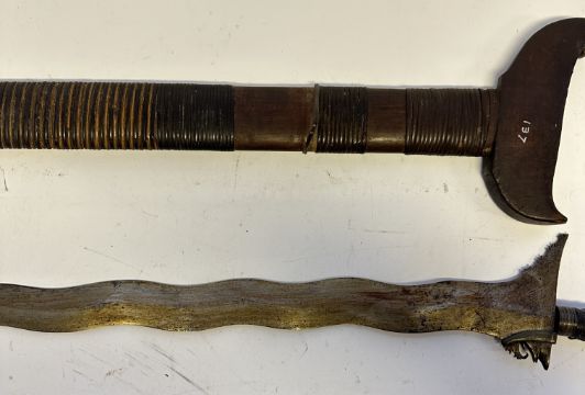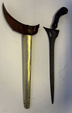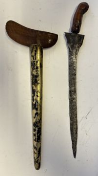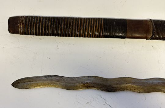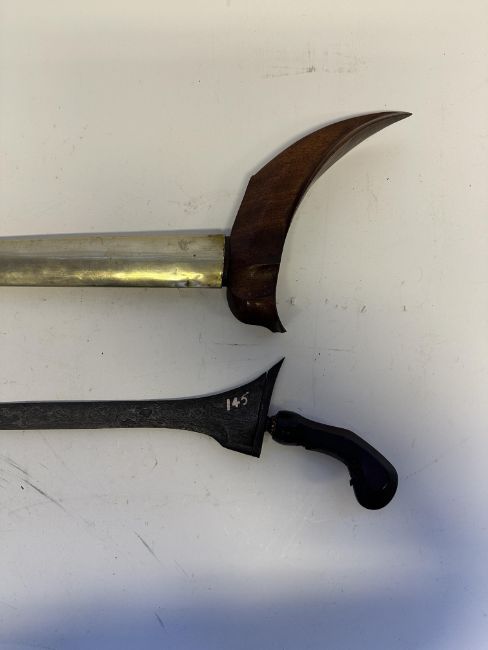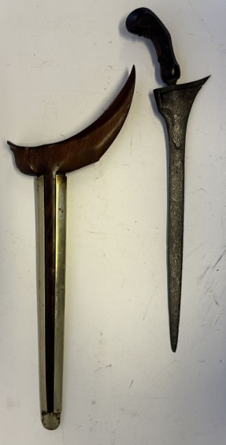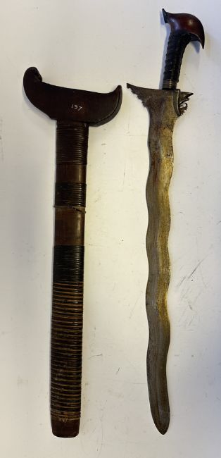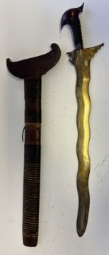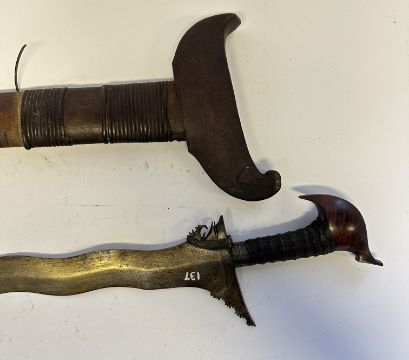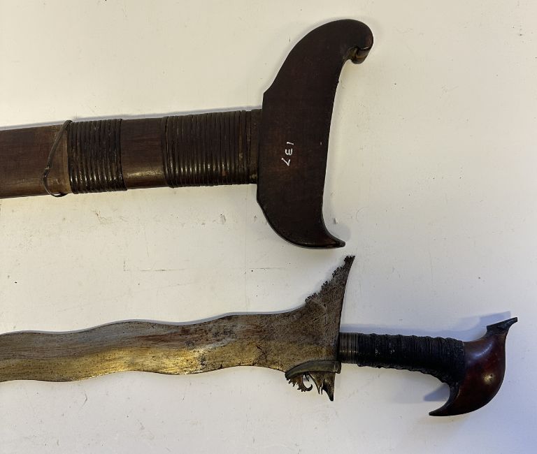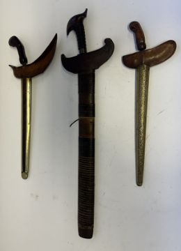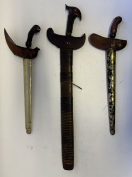 the first with waved double-edged blade with beaked and cusped gandja, wire-bound grip covered in composition, and characteristically beaked wooden pommel (old chip), in its wooden scabbard with rattan bindings (incomplete at the chape) and boat-shaped wooden sarongan; the second each with pattern-welded blade, and carved wooden planar hilt (one mendaq missing), each in its wooden scabbard with boat-shaped sarongan and copper-alloy pendoq, one embossed and chased with foliage inhabited by birds along one side, the first: 55.0 cm blade (3)
