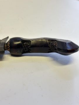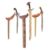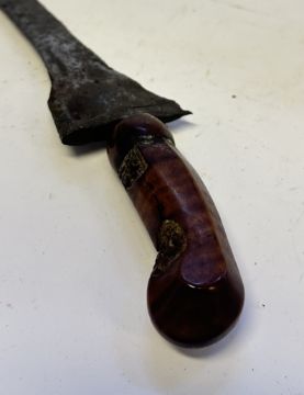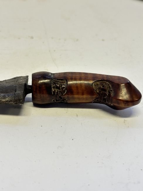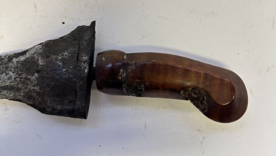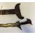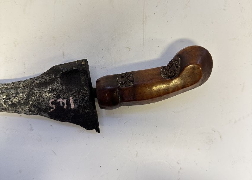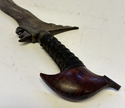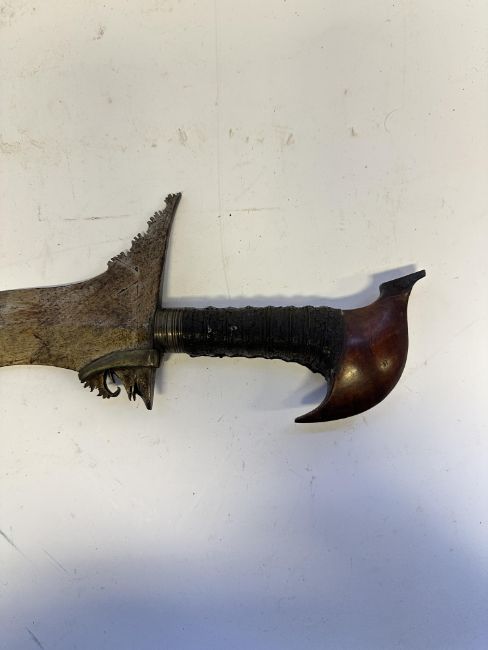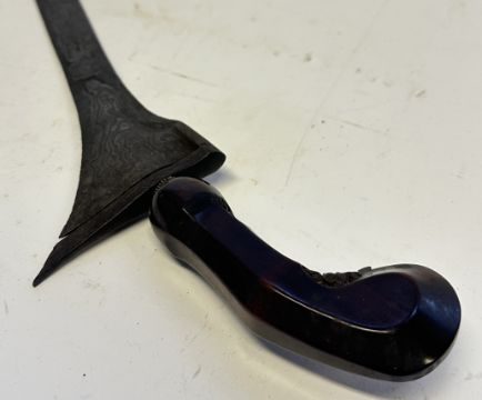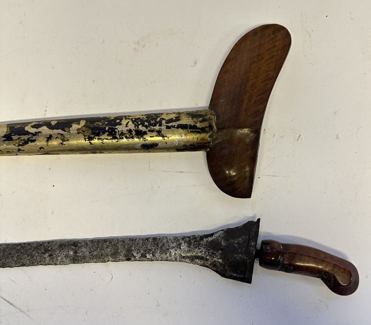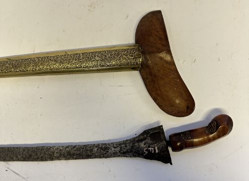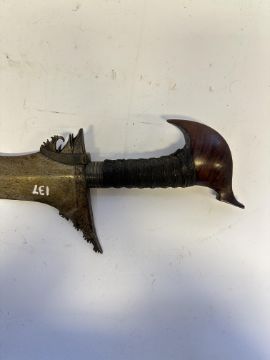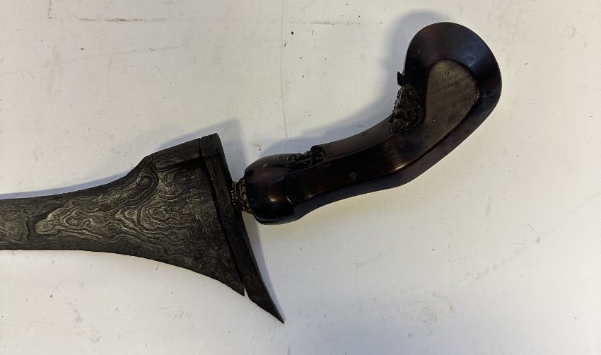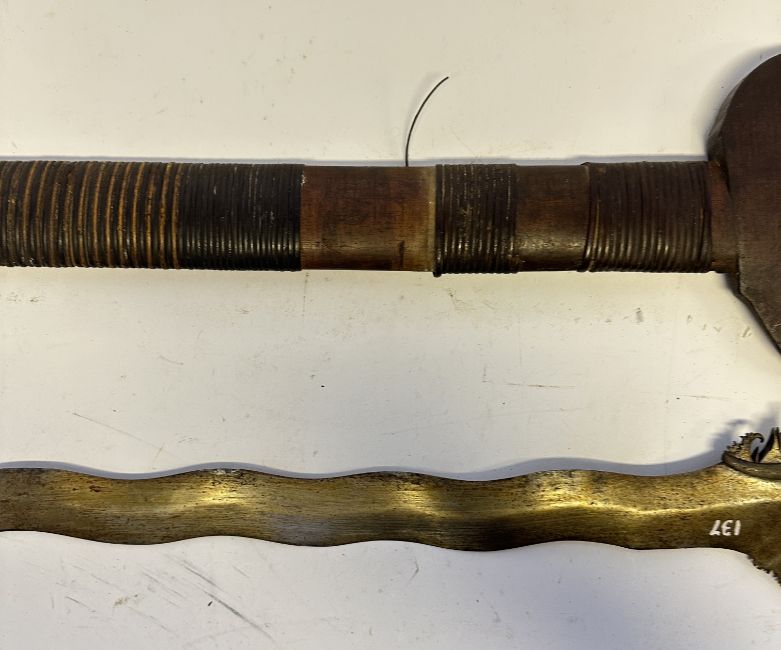the first with waved double-edged blade with beaked and cusped gandja, wire-bound grip covered in composition, and characteristically beaked wooden pommel (old chip), in its wooden scabbard with rattan bindings (incomplete at the chape) and boat-shaped wooden sarongan; the second each with pattern-welded blade, and carved wooden planar hilt (one mendaq missing), each in its wooden scabbard with boat-shaped sarongan and copper-alloy pendoq, one embossed and chased with foliage inhabited by birds along one side, the first: 55.0 cm blade (3)