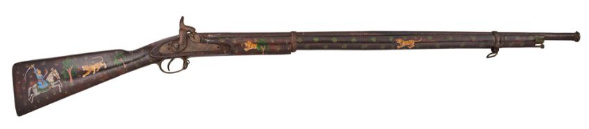 in the style of an English service musket, the stock painted in polychrome with tiger hunting scenes, 88.8 cm barrel