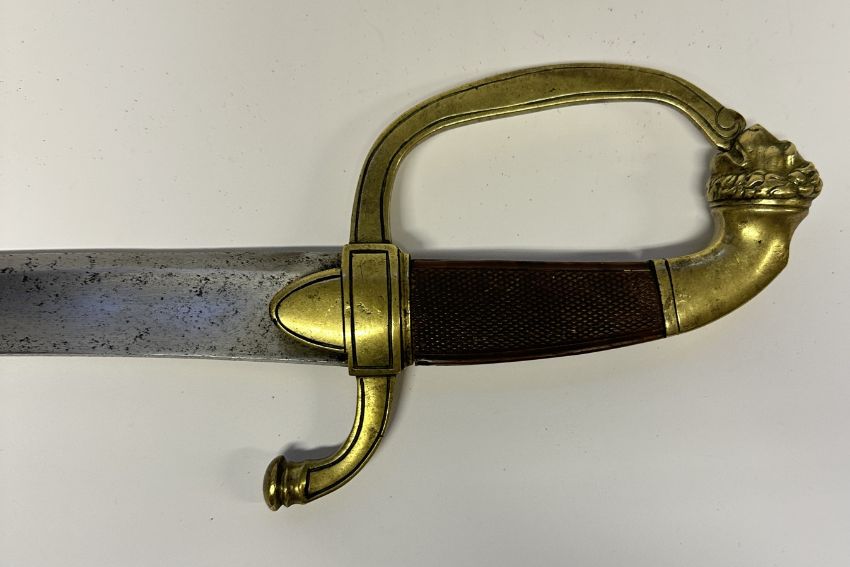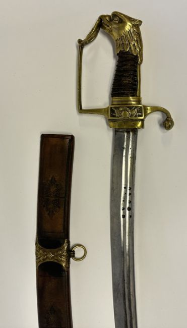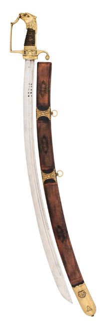 with slightly curved fullered blade (old pitting) double-edged towards the point and etched with Klingenthal Coulaux Feres manufactory details along the back at the forte, copper-alloy hilt comprising ovoidal langets, downcurved rear quillon and knuckle-guard all with line engraved borders on the outside, the latter hooked into the lion-mask pommel, and boxwood grip (minor repair at the bottom on one side) chequered along both sides; together with a composite French sabre, early 19th century, with earlier slightly curved bright blade double-edged towards the point and cut with a pair of fullers along the back over most of its length on both sides, the latter each stamped with letters, copper-alloy hilt comprising rectangular quillon-block cast with a differing martial trophy on both sides, downcurved rear quillon with bud-shaped terminal, knuckle-guard with a wreath at the top suspended from the beak of the eagle-head pommel, and wire-bound leather-covered grip, in modern wooden scabbard covered in brown leather lightly tooled on the outside and with copper-alloy chape and suspension mounts, and two rings for suspension, 87.5 cm and 81.5 cm blades (2)